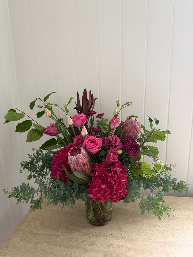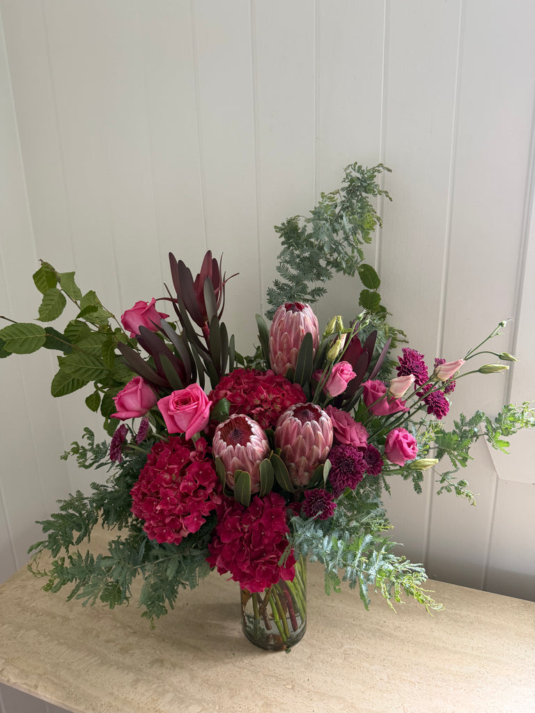 A bold Valentine’s Day arrangement featuring seasonal, Australian-grown flowers, with our signature native elements at the heart of the design, layered with sculptural texture throughout.